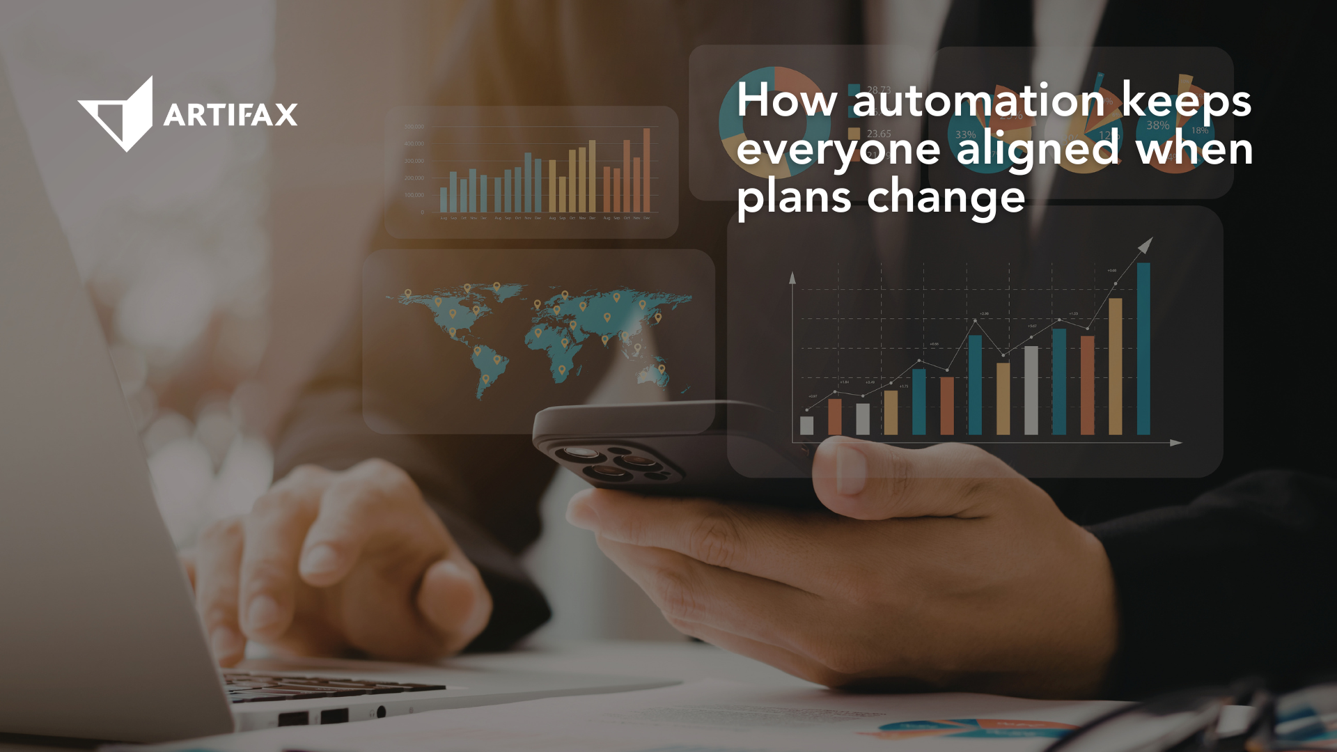 Business professional using a smartphone and laptop with data dashboards, illustrating how automation improves communication and keeps teams aligned when plans change